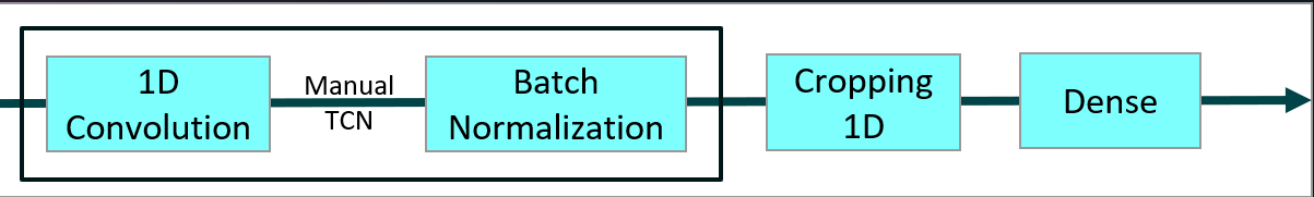 - TCN v2.0 - Manually implemented TCN using the functional API, with residual blocks, convolution layers, batch normalization, and optional dropout before cropping and dense output.